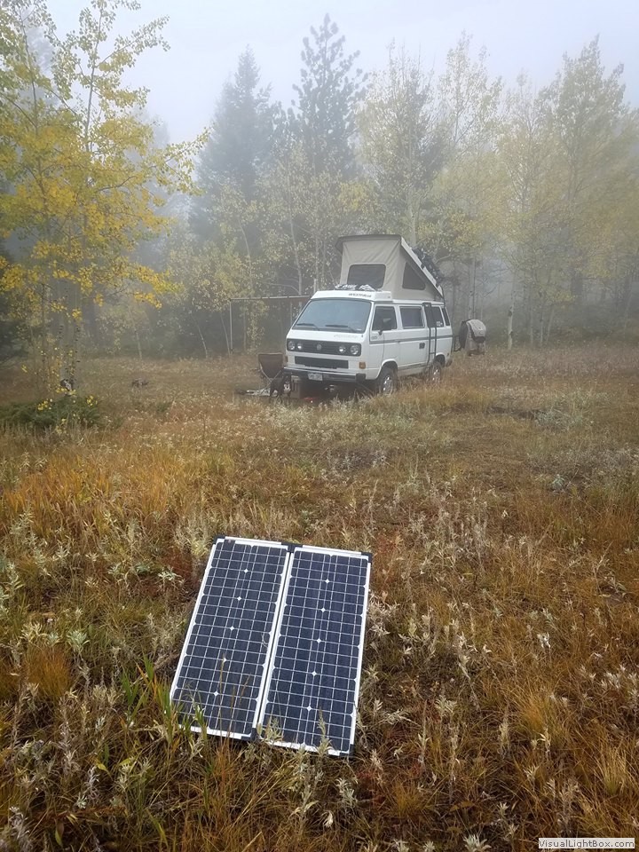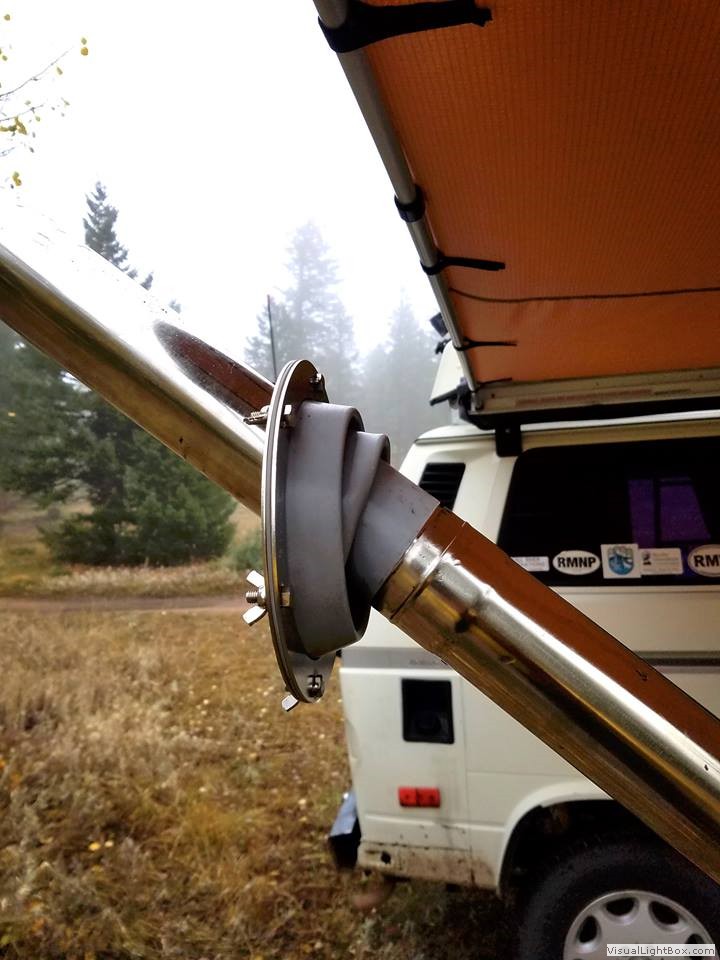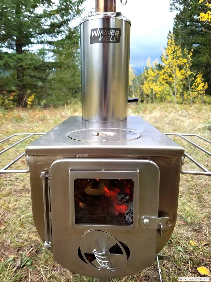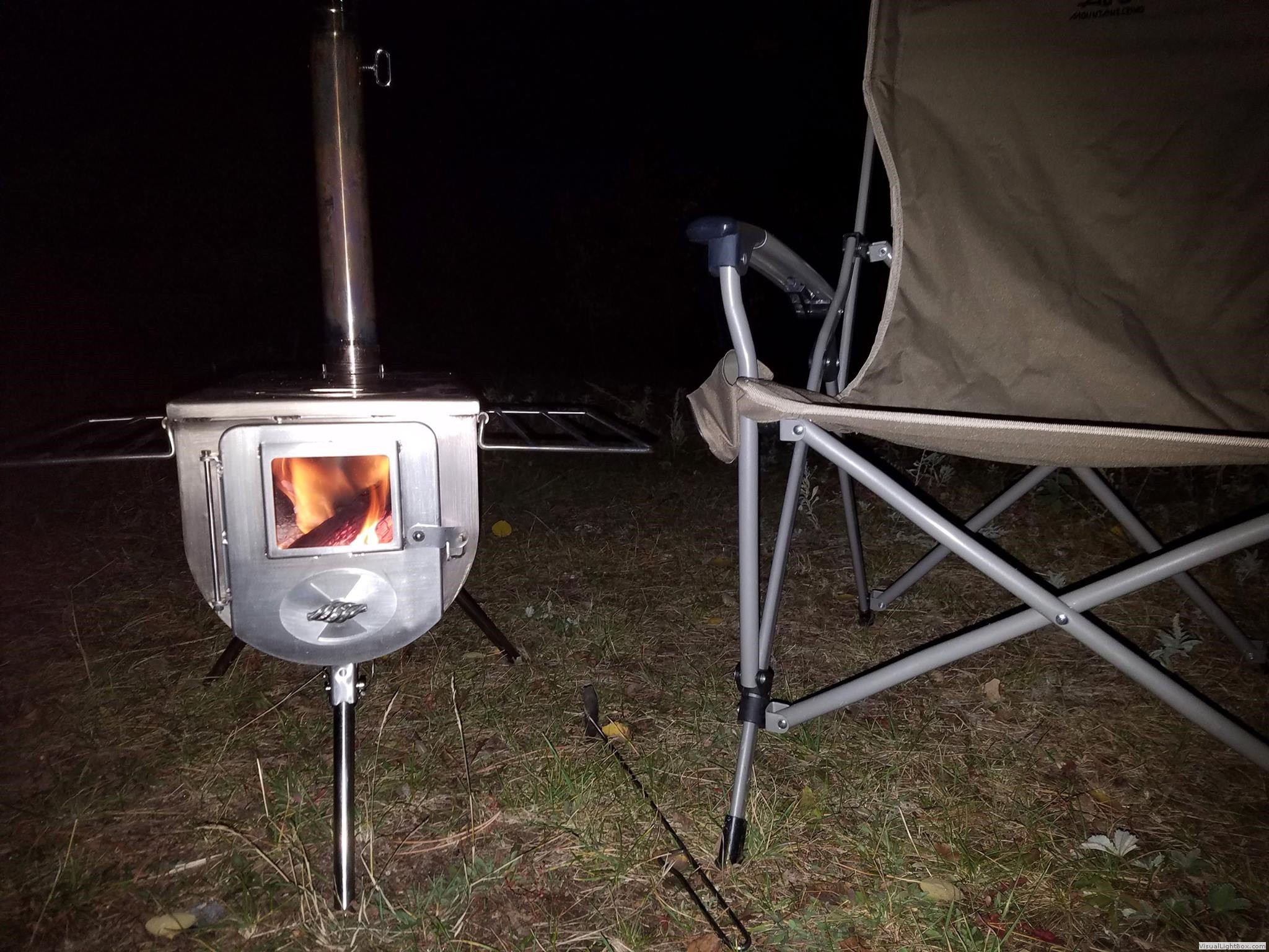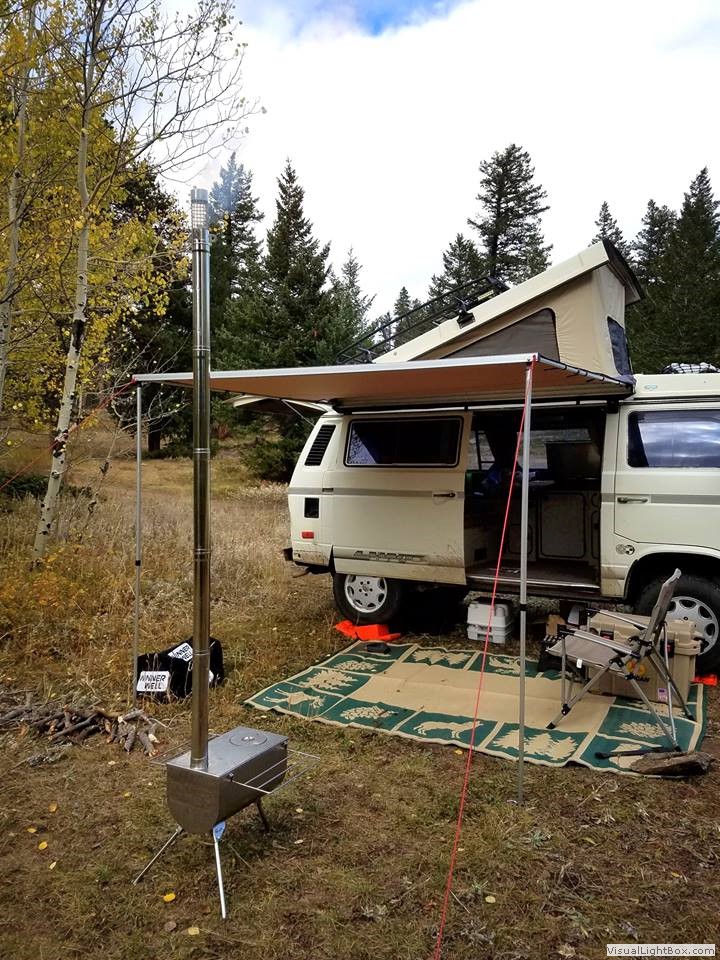 | The gallery below shows a campsite in the Johnny Park area of Roosevelt National Forest. The elevation is about 8700' and in an area with many established dispersed camping sites. During this foggy camp, I tested out my new wood stove and how I will use it inside my 3-wall tent in the winter. You can see the stovepipe angles out in a couple of the pictures with a silicone flashing kit that will attach to the tent wall. With the tent up and the wood stove cranking out the heat, my hope is that it will keep me nice and warm. |