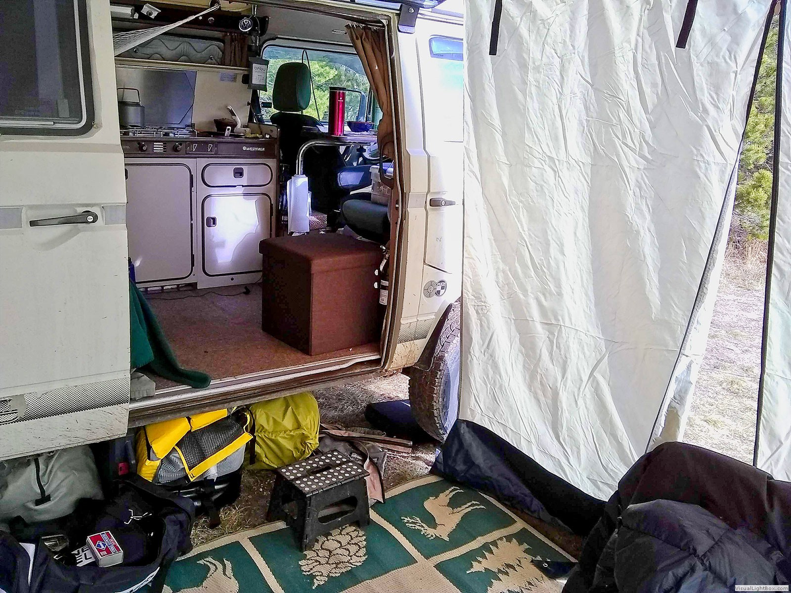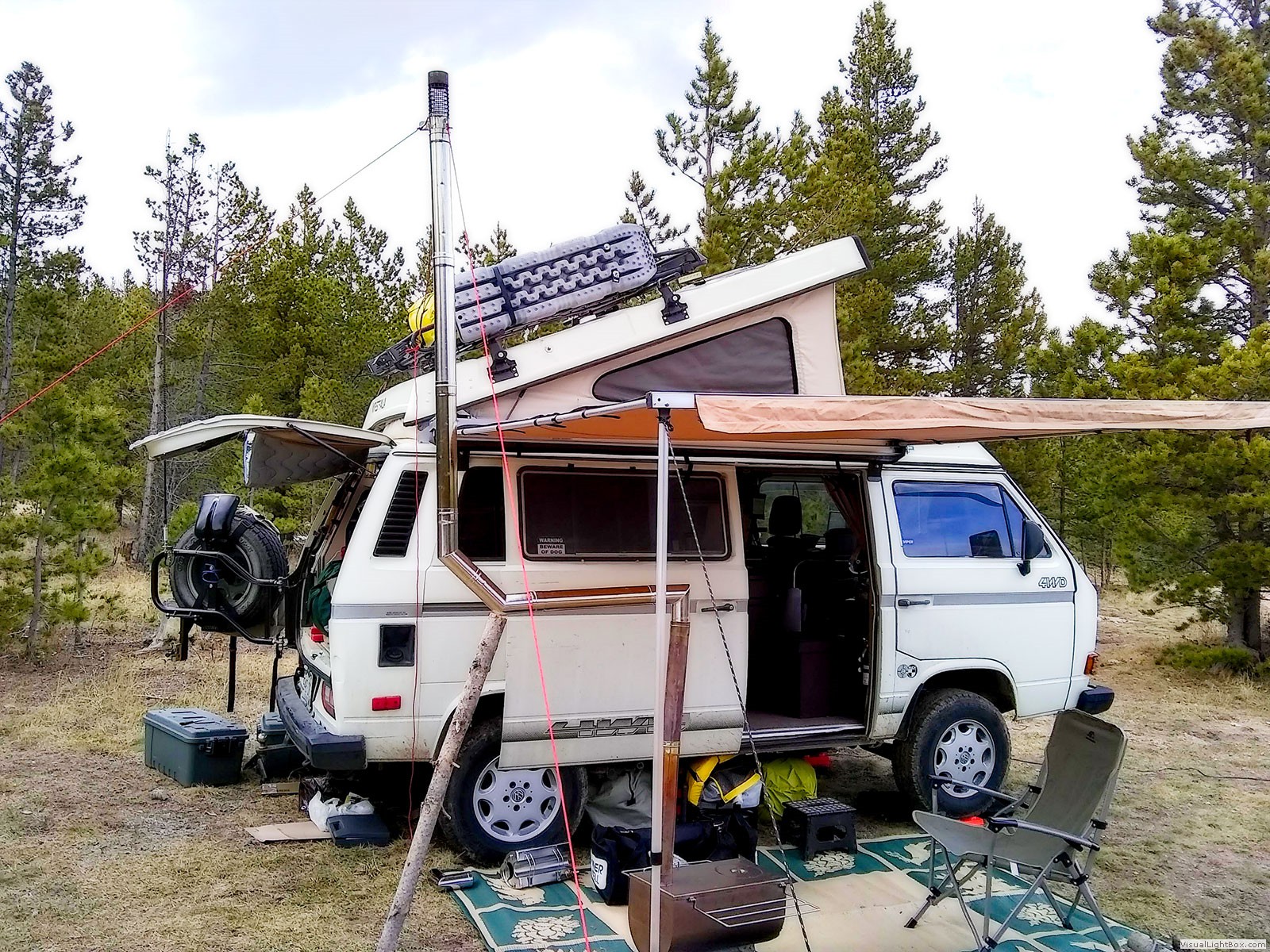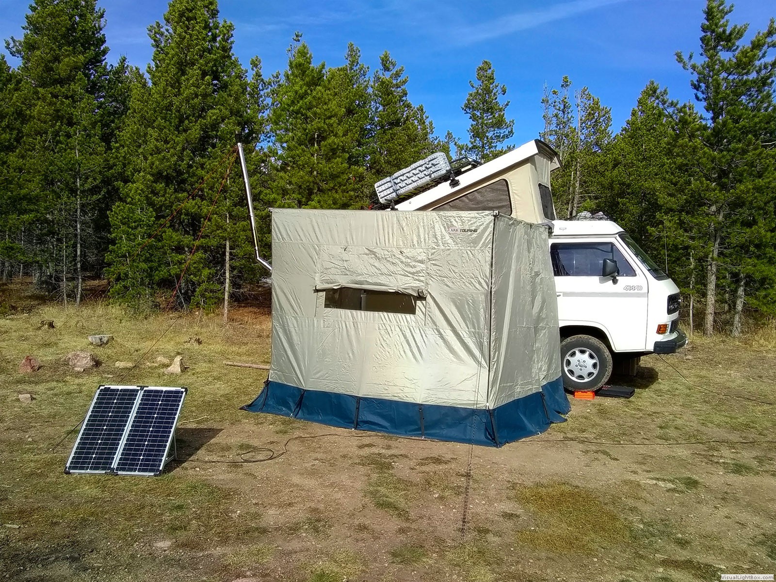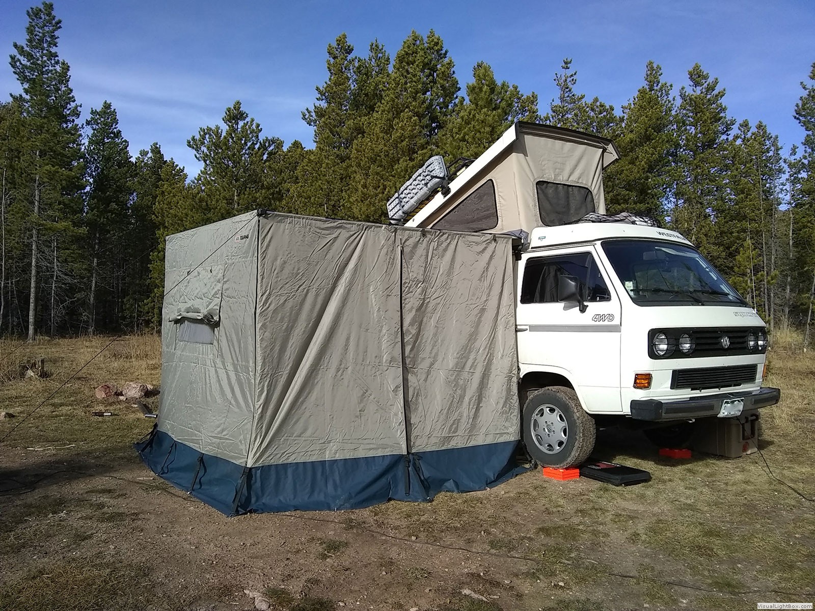 THe ARB Awning is a great addition to my Syncro and provides shade and cover from the rain and snow. The awning is attached to the rain gutter using a ARB/SUNSEEKER MOUNTING KIT FOR VANAGON from Rocky Mountain Westy/Van Cafe and has been rock solid. The awning is even further enhanced with optional accessories, such as the 3-Wall Tent and Screen Room. My awning is the 2500x2500 size, which is about 8', 2" x 8' x 2". The tent and screen room size must correspond to the size awning you have. The 3-wall tent does not have a floor, which is preferrable by me since I use my Winnerwell wood stove in there and really don't want to burn any holes in the floor. I'm not even sure ARB still makes the 3-wall tent and screen room anymore and may have replaced both with their newer ARB 813108A Awning Room (Deluxe w/Floor 2500mm x 2500mm The main issue with the awning, especially with the tent or screen room attached is wind. Extreme care must be taken when staking down the awning and accessories to keep it safe during mild winds. With heavy winds, it is advisable to remove any accessories and roll the awning back up into the storage bag. I learned this the hard way during a winter storm camped at around 9,000 feet. I woke up to a horrible flapping noise and found the tent had come loose and was acting like a sail. I managed to bend all four poles on the awning, as well as ripping off one of the stake down areas on the tent. I was just glad I didn't have a fire going in the wood stove, which would have added another horrific layer of calamity to the situation. Fortunately the replacement poles are relatively inexpensive and I was able to repair the damage for less than I thought it would cost. Now I try to pick a campsite with some protection from the prevailing winds, like a good bank of trees, and I also spend a good amount of time making sure I have staked the entire system down as securely as possible. To further secure my awning to the ground, I invested in the ARB Guy Rope Set, which inorporates a spring to help absorb the energy produced by the wind and helps prevent damage to the awning. I also found some similar springs on Amazon (see left) which I'll use to augment the ARB versions and these are much less expensive. The ARB versions come in a two pack and are around $22. The springs I found on Amazon are five for under $15. Even these probably won't help much if I find myself in another storm with 70 mph wind gusts, like I experienced during my unfortunate incident describe above, but I think it's good insurance for more moderate and typical winds. I also puchased a bunch of good stakes to replace the cheaper stakes that come with the awning and accessories. The 3-wall tent is in three individual sections (see images below), which zipper together to fully enclose the van. But they can also be used individually if you only want to put up one or two sides, preserving an epic view or for some privacy from nearby campers. By the way, the fourth wall is the van in case you were wondering. To further enhance the usability of the tent, I got a portable wood burning stove. It's stainless steel so it won't rust or ever need painting and it all fits into a nice storage bag which I keep on the roof rack while traveling. I had to cut a hole in the tent for the stove pipe, which was a bit intimidating, but I too my time and did several mock setups to make sure I had all my measurements correct before committing to cutting a hole in my beautiful tent. I'll create another page dedicated to using this stove in the near future, so stay tuned. The screen room is a four wall mesh room with a zippered entrance on the front side. It also has a zippered entrance to the vehicle. There is no floor, but the way it stakes down, there is very little chance of bugs gaining entrance via the wall. Using it with my Vanagon, a little extra care is needed to seal it against the body of the van. I use neodymium magnets to seal up any gaps, as seen in the video below. Since I don't have a removable screen for the sliding door, this more than makes up for it, while adding a great deal of bug proof living space. I have really enjoyed hanging out in the screen room on one of my comfy folding chairs, free from pesky insects. |
