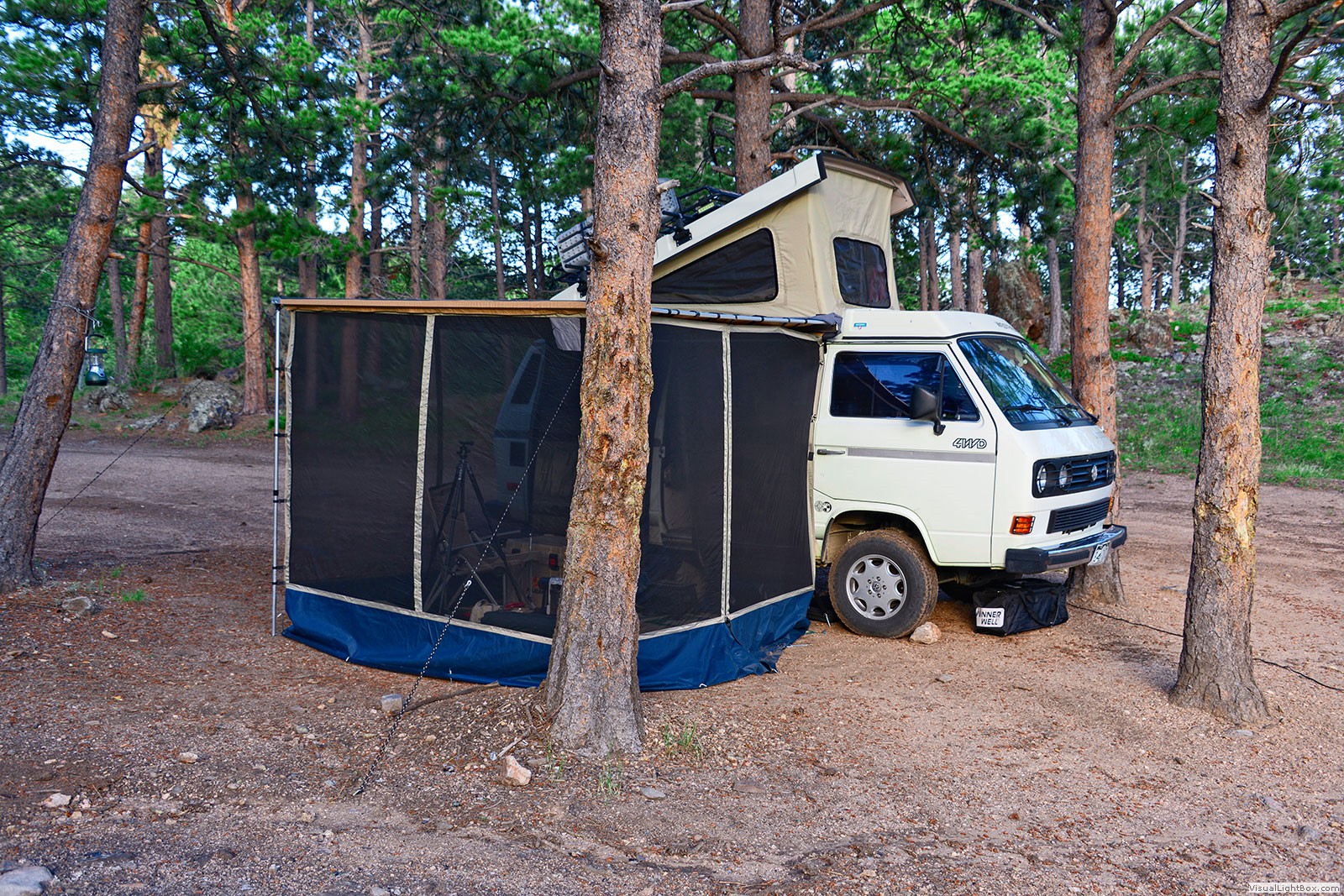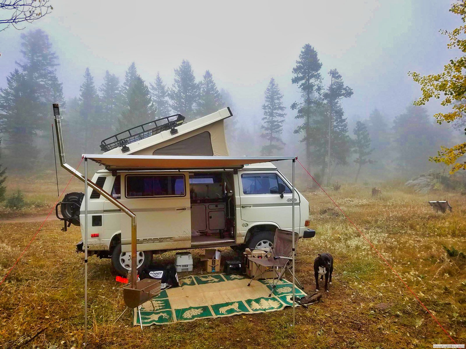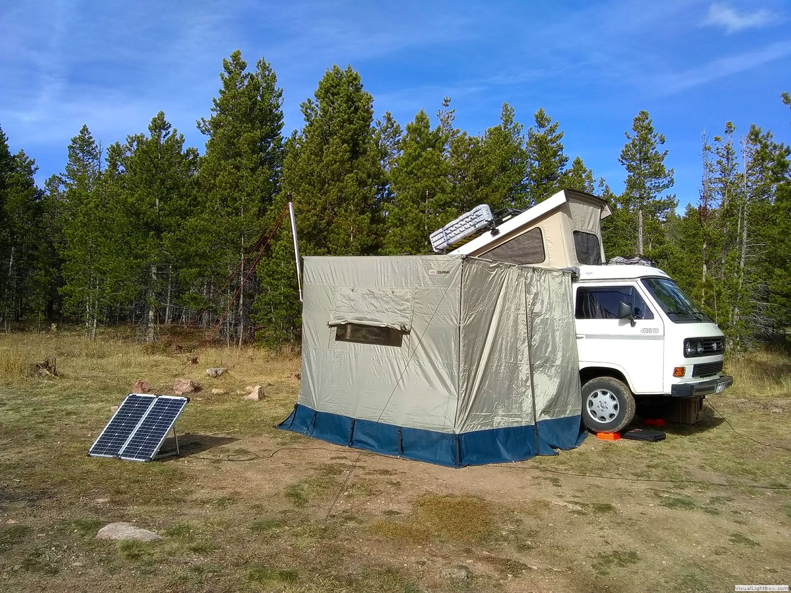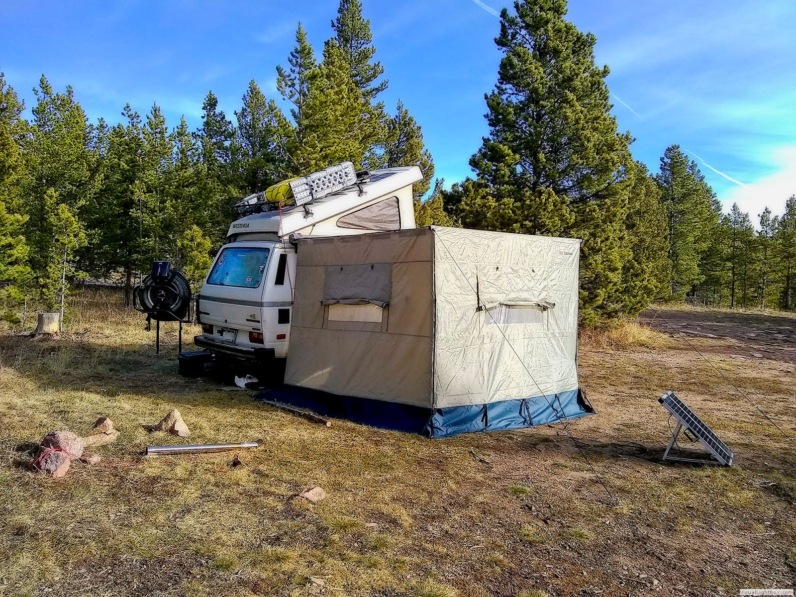 THe ARB Awning is a great addition to my Syncro and provides shade and cover from the rain and snow. The awning is attached to the rain gutter using a ARB/SUNSEEKER MOUNTING KIT FOR VANAGON from Rocky Mountain Westy/Van Cafe and has been rock solid. The awning is even further enhanced with optional accessories, such as the 3-Wall Tent and Screen Room. My awning is the 2500x2500 size, which is about 8', 2" x 8' x 2". The tent and screen room size must correspond to the size awning you have. The 3-wall tent does not have a floor, which is preferrable by me since I use my Winnerwell wood stove in there and really don't want to burn any holes in the floor. I'm not even sure ARB still makes the 3-wall tent and screen room anymore and may have replaced both with their newer ARB 813108A Awning Room (Deluxe w/Floor 2500mm x 2500mm The main issue with the awning, especially with the tent or screen room attached is wind. Extreme care must be taken when staking down the awning and accessories to keep it safe during mild winds. With heavy winds, it is advisable to remove any accessories and roll the awning back up into the storage bag. I learned this the hard way during a winter storm camped at around 9,000 feet. I woke up to a horrible flapping noise and found the tent had come loose and was acting like a sail. I managed to bend all four poles on the awning, as well as ripping off one of the stake down areas on the tent. I was just glad I didn't have a fire going in the wood stove, which would have added another horrific layer of calamity to the situation. Fortunately the replacement poles are relatively inexpensive and I was able to repair the damage for less than I thought it would cost. Now I try to pick a campsite with some protection from the prevailing winds, like a good bank of trees, and I also spend a good amount of time making sure I have staked the entire system down as securely as possible. To further secure my awning to the ground, I invested in the ARB Guy Rope Set, which inorporates a spring to help absorb the energy produced by the wind and helps prevent damage to the awning. I also found some similar springs on Amazon (see left) which I'll use to augment the ARB versions and these are much less expensive. The ARB versions come in a two pack and are around $22. The springs I found on Amazon are five for under $15. Even these probably won't help much if I find myself in another storm with 70 mph wind gusts, like I experienced during my unfortunate incident describe above, but I think it's good insurance for more moderate and typical winds. I also puchased a bunch of good stakes to replace the cheaper stakes that come with the awning and accessories. The 3-wall tent is in three individual sections (see images below), which zipper together to fully enclose the van. But they can also be used individually if you only want to put up one or two sides, preserving an epic view or for some privacy from nearby campers. By the way, the fourth wall is the van in case you were wondering. To further enhance the usability of the tent, I got a portable wood burning stove. It's stainless steel so it won't rust or ever need painting and it all fits into a nice storage bag which I keep on the roof rack while traveling. I had to cut a hole in the tent for the stove pipe, which was a bit intimidating, but I too my time and did several mock setups to make sure I had all my measurements correct before committing to cutting a hole in my beautiful tent. I'll create another page dedicated to using this stove in the near future, so stay tuned. The screen room is a four wall mesh room with a zippered entrance on the front side. It also has a zippered entrance to the vehicle. There is no floor, but the way it stakes down, there is very little chance of bugs gaining entrance via the wall. Using it with my Vanagon, a little extra care is needed to seal it against the body of the van. I use neodymium magnets to seal up any gaps, as seen in the video below. Since I don't have a removable screen for the sliding door, this more than makes up for it, while adding a great deal of bug proof living space. I have really enjoyed hanging out in the screen room on one of my comfy folding chairs, free from pesky insects. |