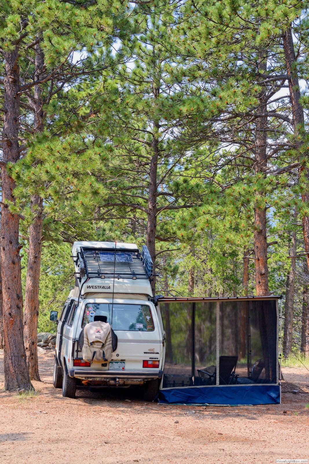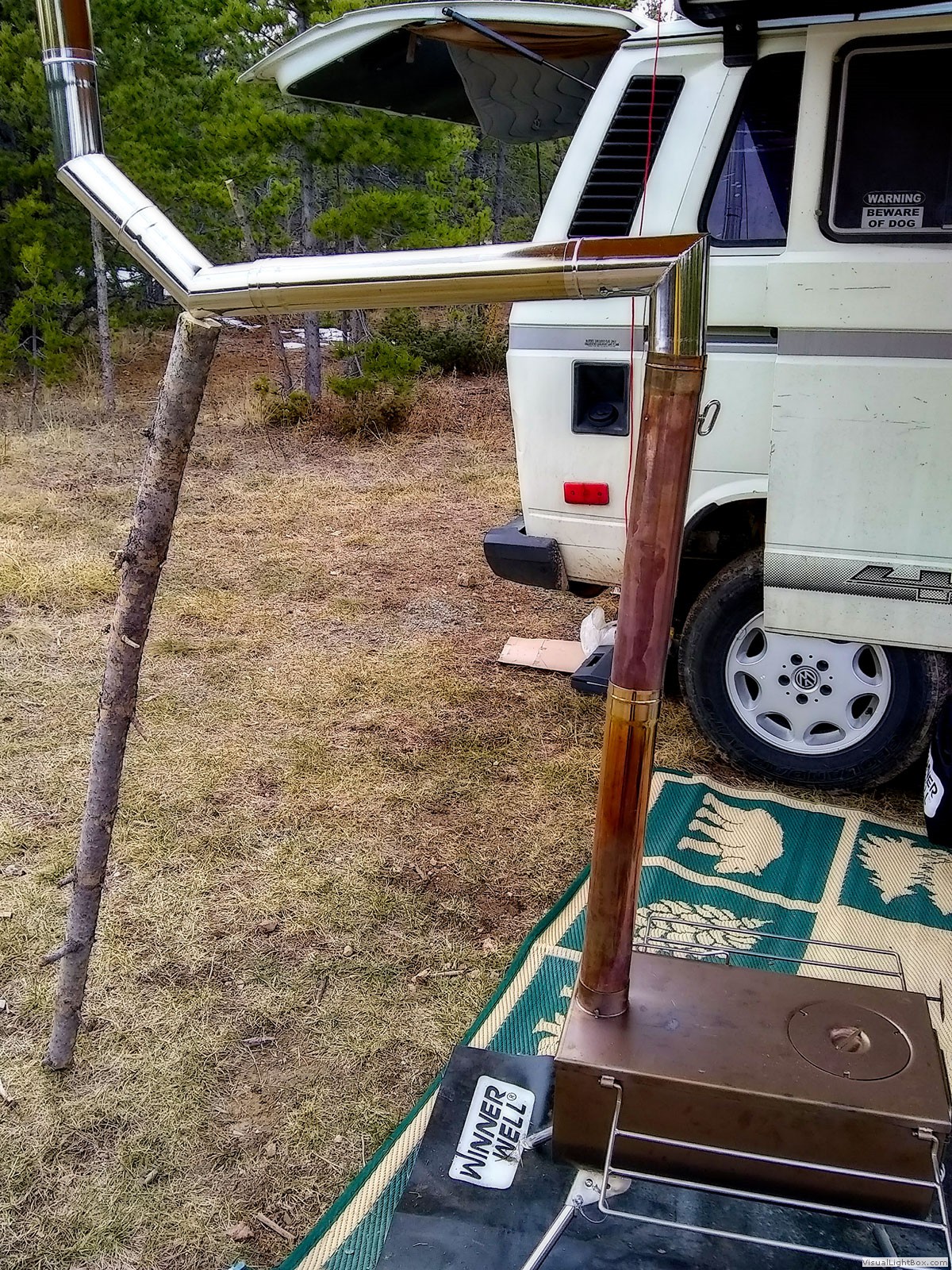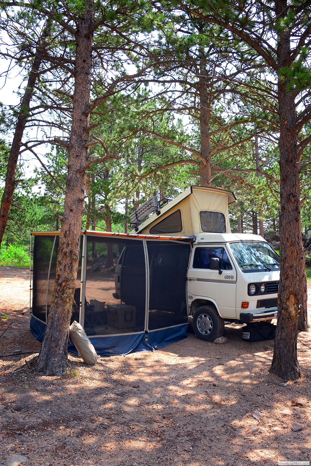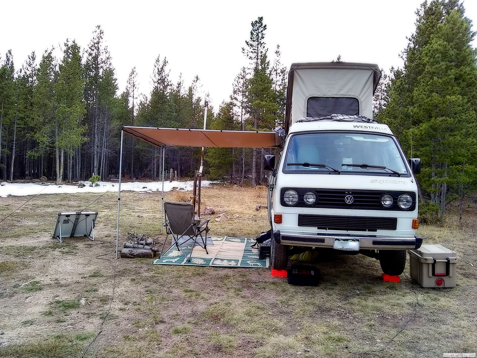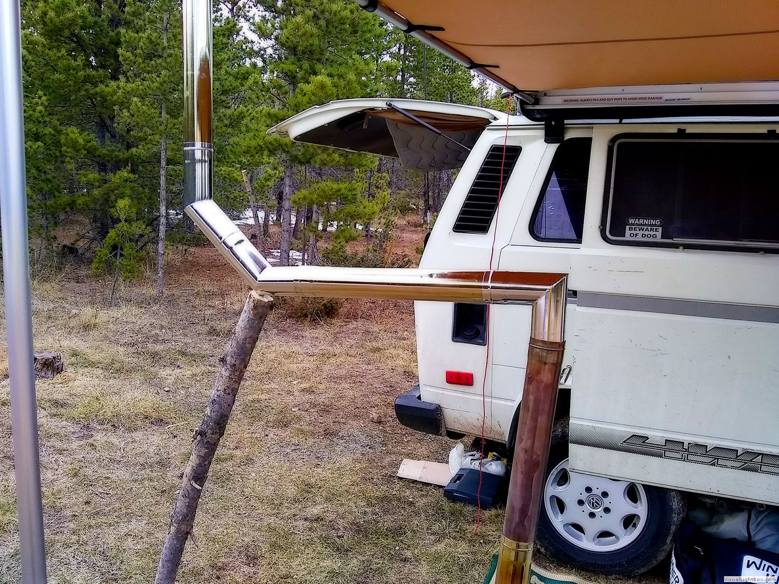 THe ARB Awning is a great addition to my Syncro and provides shade and cover from the rain and snow. The awning is attached to the rain gutter using a ARB/SUNSEEKER MOUNTING KIT FOR VANAGON from Rocky Mountain Westy/Van Cafe and has been rock solid. The awning is even further enhanced with optional accessories, such as the 3-Wall Tent and Screen Room. My awning is the 2500x2500 size, which is about 8', 2" x 8' x 2". The tent and screen room size must correspond to the size awning you have. The 3-wall tent does not have a floor, which is preferrable by me since I use my Winnerwell wood stove in there and really don't want to burn any holes in the floor. I'm not even sure ARB still makes the 3-wall tent and screen room anymore and may have replaced both with their newer ARB 813108A Awning Room (Deluxe w/Floor 2500mm x 2500mm The main issue with the awning, especially with the tent or screen room attached is wind. Extreme care must be taken when staking down the awning and accessories to keep it safe during mild winds. With heavy winds, it is advisable to remove any accessories and roll the awning back up into the storage bag. I learned this the hard way during a winter storm camped at around 9,000 feet. I woke up to a horrible flapping noise and found the tent had come loose and was acting like a sail. I managed to bend all four poles on the awning, as well as ripping off one of the stake down areas on the tent. I was just glad I didn't have a fire going in the wood stove, which would have added another horrific layer of calamity to the situation. Fortunately the replacement poles are relatively inexpensive and I was able to repair the damage for less than I thought it would cost. Now I try to pick a campsite with some protection from the prevailing winds, like a good bank of trees, and I also spend a good amount of time making sure I have staked the entire system down as securely as possible. To further secure my awning to the ground, I invested in the ARB Guy Rope Set, which inorporates a spring to help absorb the energy produced by the wind and helps prevent damage to the awning. I also found some similar springs on Amazon (see left) which I'll use to augment the ARB versions and these are much less expensive. The ARB versions come in a two pack and are around $22. The springs I found on Amazon are five for under $15. Even these probably won't help much if I find myself in another storm with 70 mph wind gusts, like I experienced during my unfortunate incident describe above, but I think it's good insurance for more moderate and typical winds. I also puchased a bunch of good stakes to replace the cheaper stakes that come with the awning and accessories. The 3-wall tent is in three individual sections (see images below), which zipper together to fully enclose the van. But they can also be used individually if you only want to put up one or two sides, preserving an epic view or for some privacy from nearby campers. By the way, the fourth wall is the van in case you were wondering. To further enhance the usability of the tent, I got a portable wood burning stove. It's stainless steel so it won't rust or ever need painting and it all fits into a nice storage bag which I keep on the roof rack while traveling. I had to cut a hole in the tent for the stove pipe, which was a bit intimidating, but I too my time and did several mock setups to make sure I had all my measurements correct before committing to cutting a hole in my beautiful tent. I'll create another page dedicated to using this stove in the near future, so stay tuned. The screen room is a four wall mesh room with a zippered entrance on the front side. It also has a zippered entrance to the vehicle. There is no floor, but the way it stakes down, there is very little chance of bugs gaining entrance via the wall. Using it with my Vanagon, a little extra care is needed to seal it against the body of the van. I use neodymium magnets to seal up any gaps, as seen in the video below. Since I don't have a removable screen for the sliding door, this more than makes up for it, while adding a great deal of bug proof living space. I have really enjoyed hanging out in the screen room on one of my comfy folding chairs, free from pesky insects. |