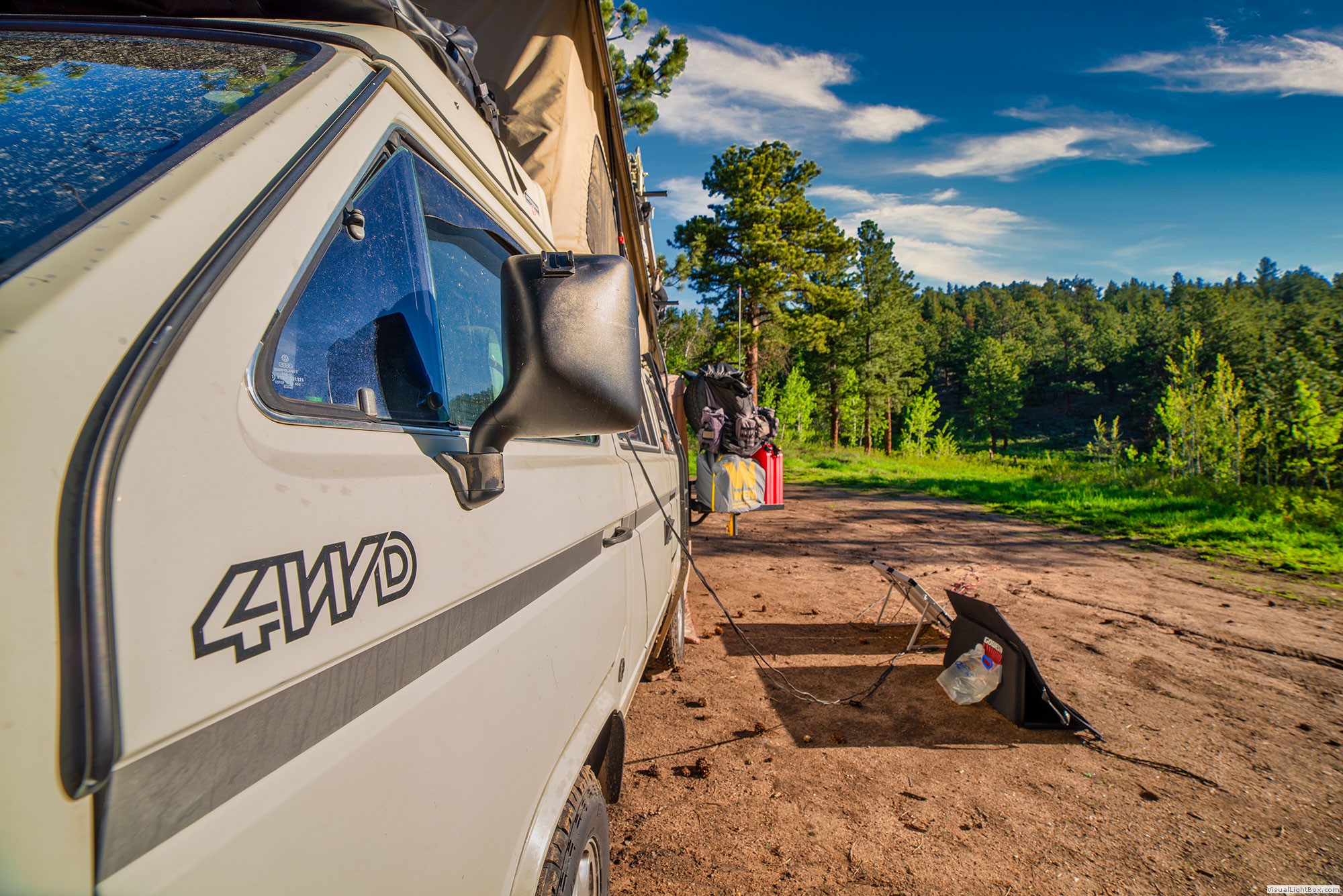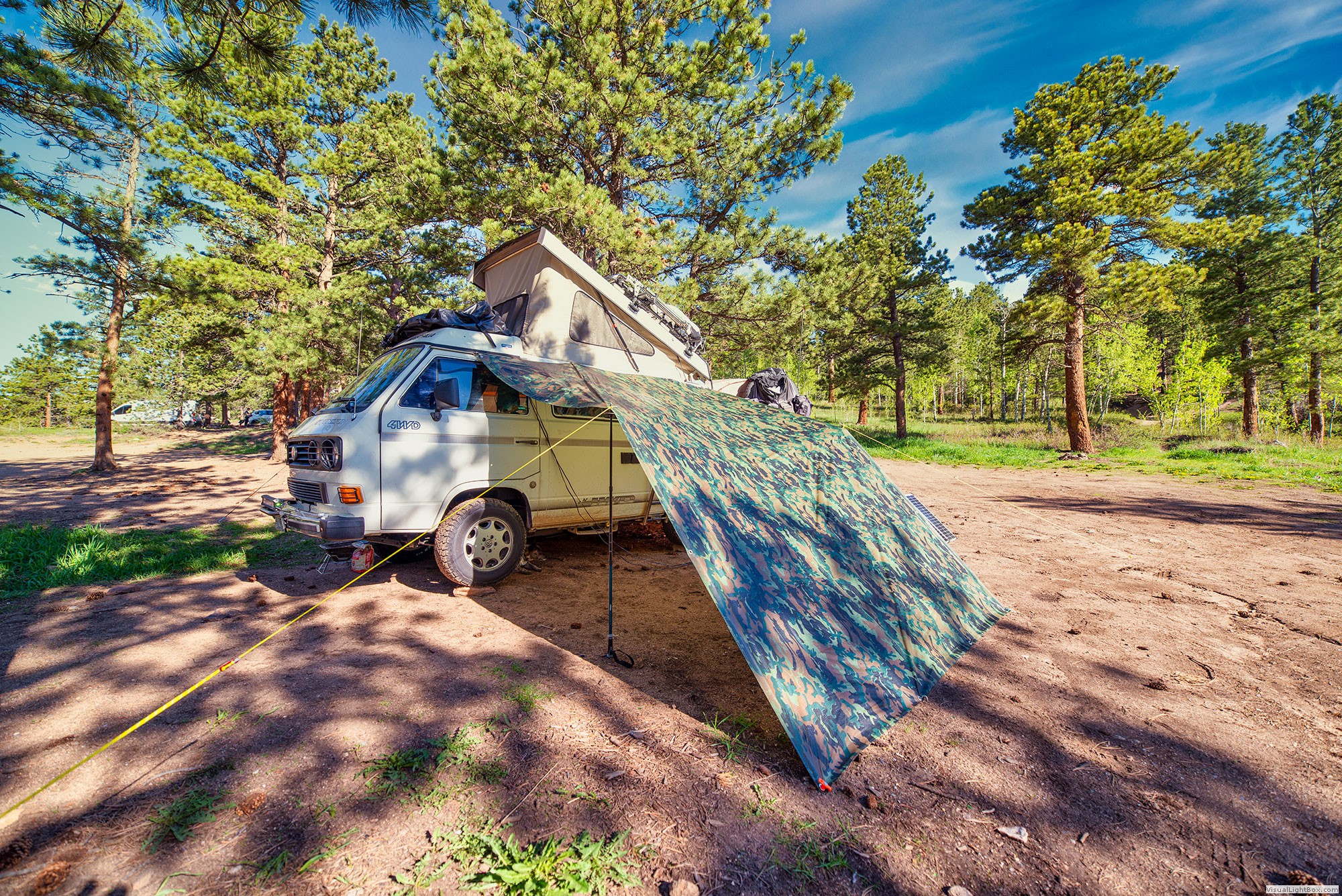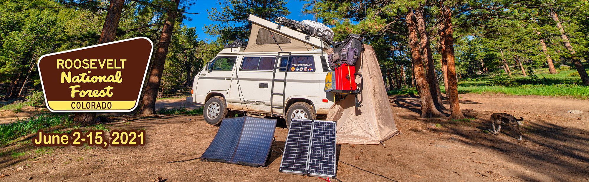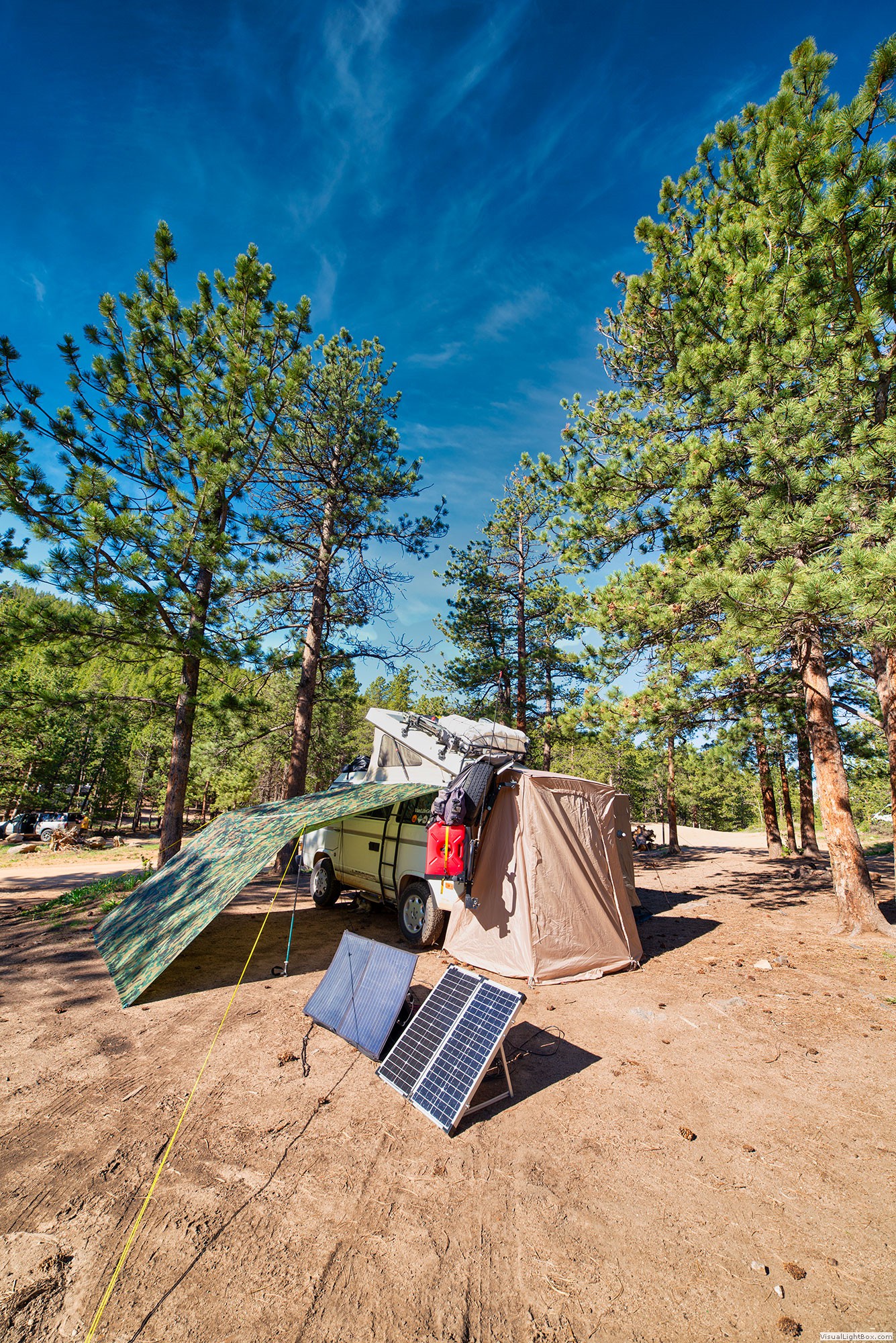 Since the dispersed camping areas where I'd planned to camp are closed due to our recent fires, I decided to visit one of my old haunts outside Rocky Mountain National Park in Roosevelt National Forest. Most of the good dispersed camping area was still closed for the season when I arrived on the 2nd of June. I had called the Forest Service before I went and they informed me that the gate to the Johnny Park area, where all the really good dispersed camping is, was not going to be open until June 15th. Of course, two days after I setup camp, they opened the gate early. I decided not to tear down camp and move. I'm way too lazy for that and figured I'd come right back after a short trip to the valley to take care of some business. This particular site is at the base of Parachute Hill Road, which has a great site just up the hill, but the road was extremely muddy and the condition was horrible, so I just settled for the big site at the base of the road. I've actually camped at this same spot many times over the years. Since there is a working ranch at the end of the road, they have to keep this road open year 'round, so it's pretty much always available. I camped here once in the dead of winter and experienced a major storm that bent all four of my awning poles, with wind gusts hitting 90 mph. During this trip, I also had one evening and night of high winds, but my new method of staking out the awning and tent worked like a champ and I had no issues with the wind. The problem with this particular area, which is before you get to the closed gate and is easily accessible, is that it can become very crowded. Over the weekends, I'll bet there were at least a dozen campsites scattered around a relatively small area. One afternoon, I discovered a group setting up their tents right behind my van. They were nice enough folks and had a bunch of dogs that Willow enjoyed playing with, but they were a little close for my taste. Over the last 25 years that I've been camping here, I've never encountered crowds like this. Everybody wants to go camping, I guess. There were many white self-customized Ram Promaster vans that came by for just a day or two, or just overnight on their way to some unknown destination. There was also a large overland vehicle that stayed a few days that was fun to see. Despite all the people, I still had a great two weeks in the forest and met quite a few really nice people. One super nice couple had a dog that was the same breed as Willow and the two dogs became fast friends and played for hours. Willow enjoyed visiting the various campsites and meeting all the people. Turns out she's a bit of a thief though, as she stole a spoon from one campsite and a lime from another. She played with that lime for a week, carrying it around like some kind of trophy. I'm not sure Willow could have enjoyed herself more, with all the people to meet and dogs to play with. Not to mention just exploring the forest and finding marshy areas to cool off in. She barked at a wild turkey that wondered into camp, sending it running off into the woods. I also had the chance to play with some new camera gear, such as my Rokinon 14mm lens, a 1.4X teleconverter for my Sigma 150-600 lens (makes the lens 840mm at full zoom!), and a Moza Slypod (a newish type of compact slider). I setup my trail-cam hoping to find some cool wildlife visiting my site at night, but only got myself going out to pee. One of these days, I'll catch something cool on that trail cam. If nothing else, I can see if any humans are checking me out at night with nefarious intentions. I flew the drone several times, gaining some much needed experience.