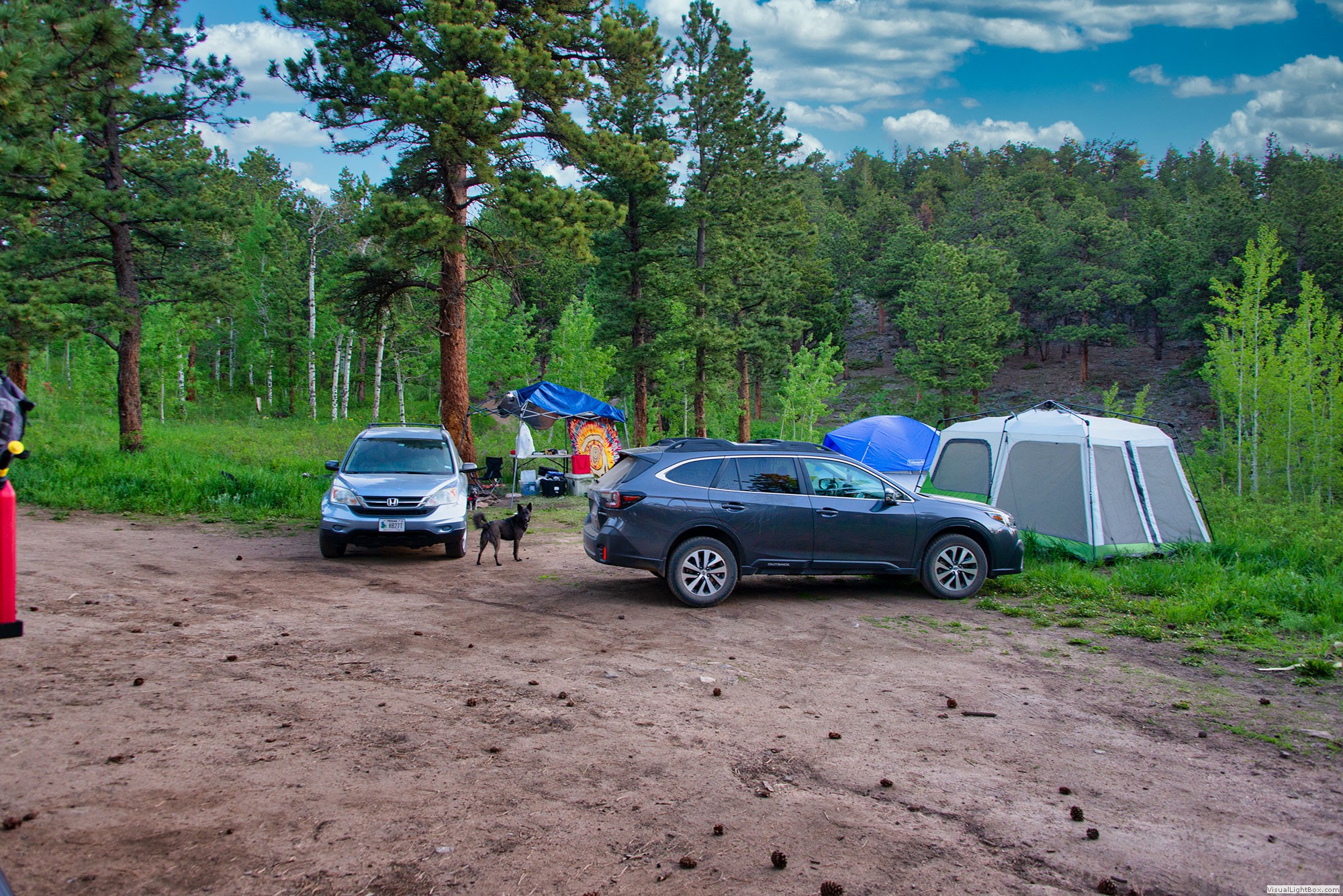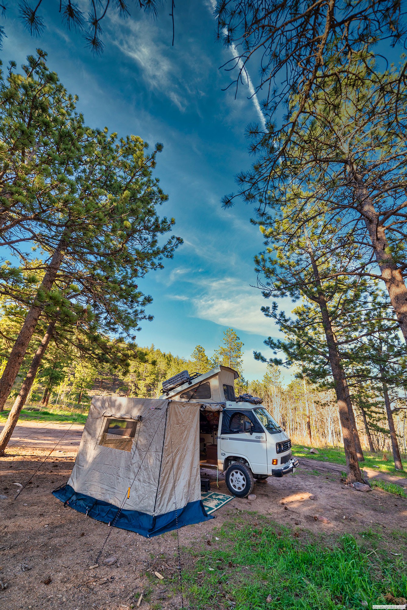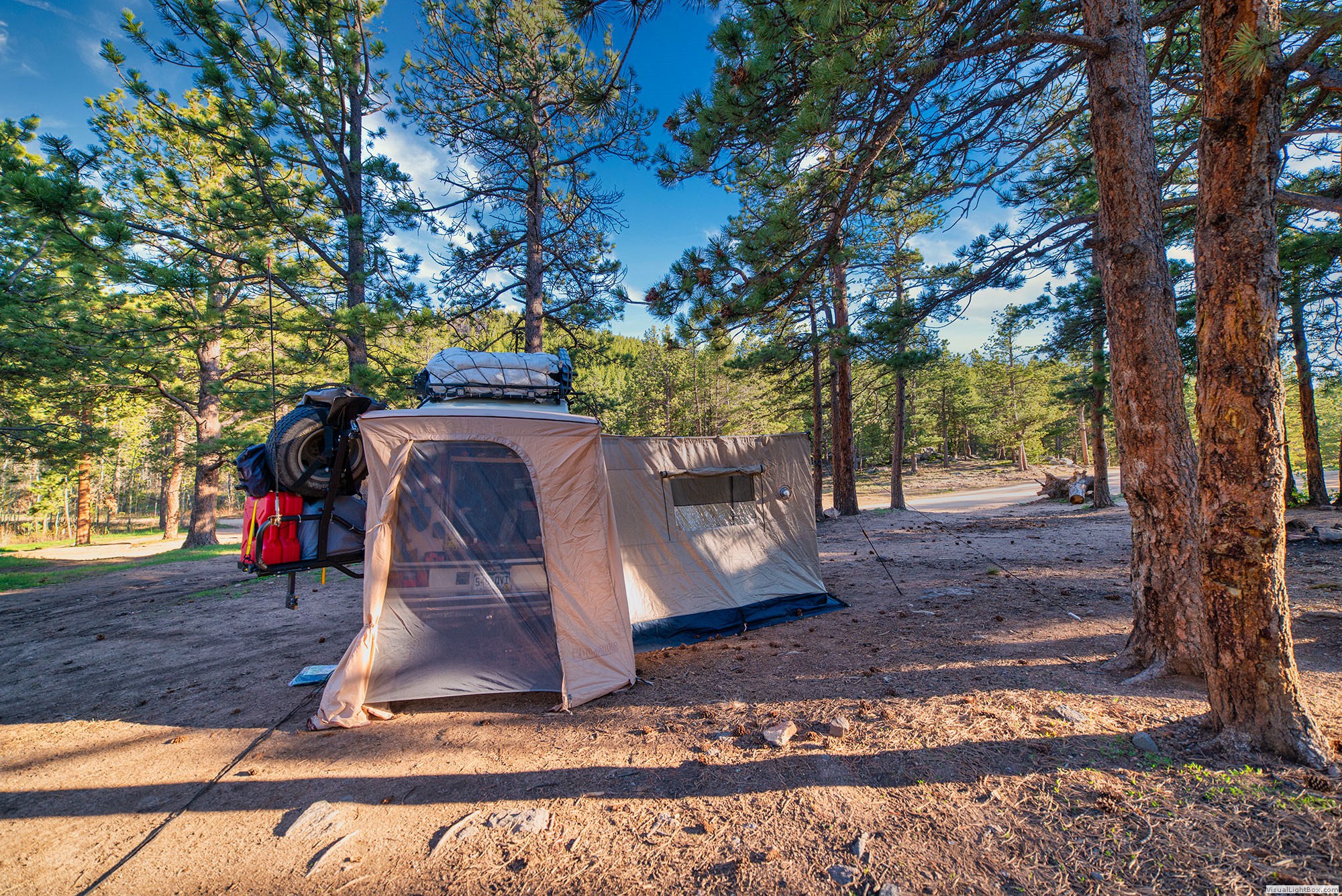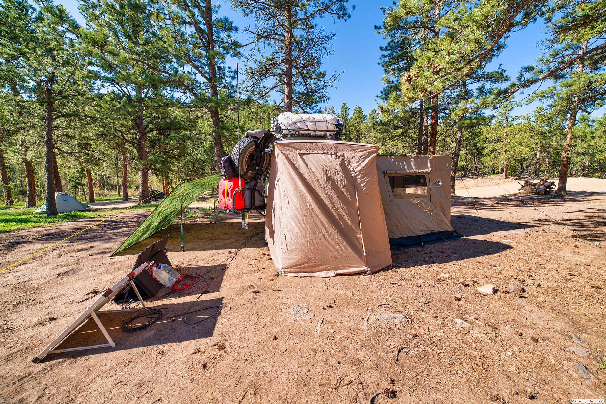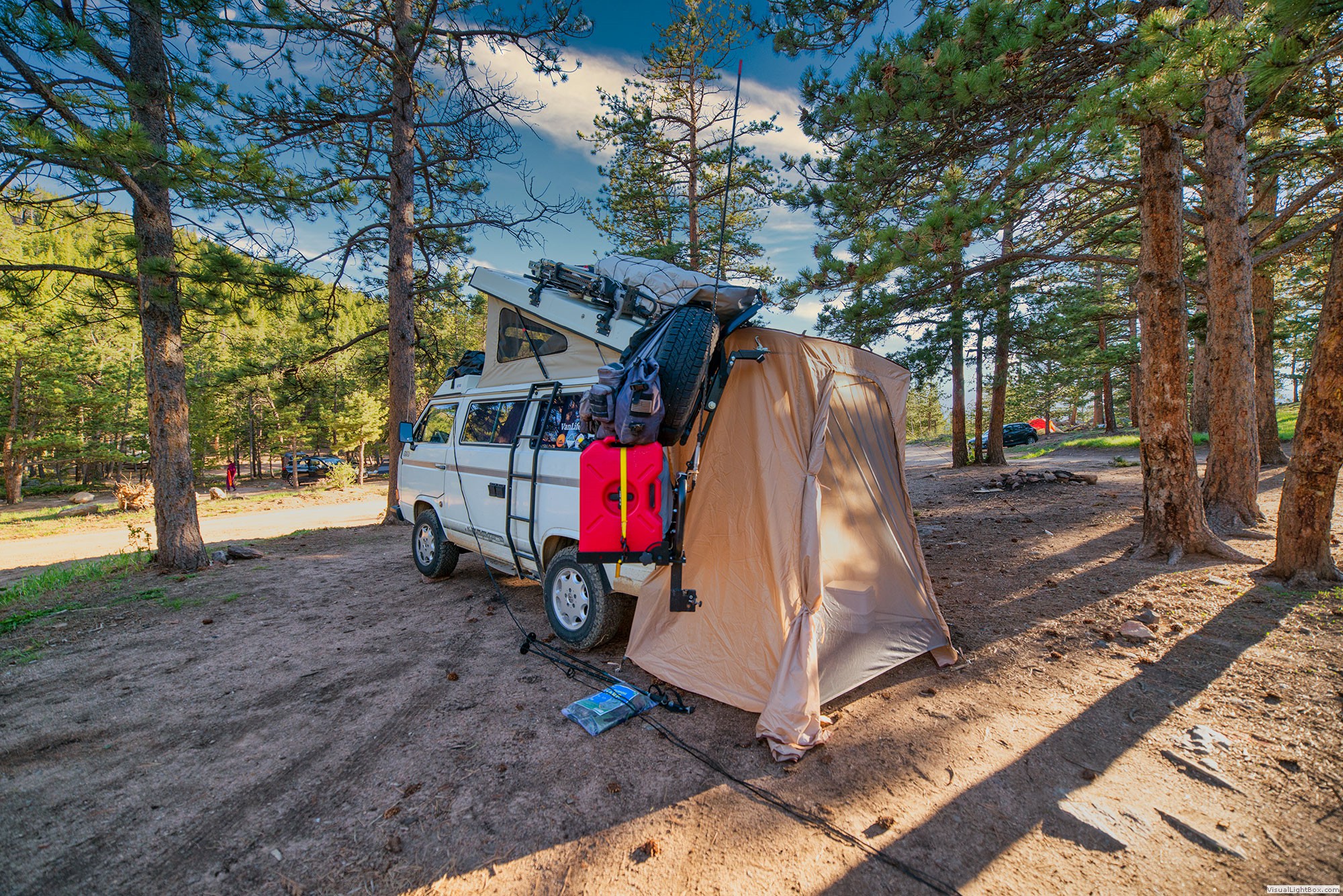 Since the dispersed camping areas where I'd planned to camp are closed due to our recent fires, I decided to visit one of my old haunts outside Rocky Mountain National Park in Roosevelt National Forest. Most of the good dispersed camping area was still closed for the season when I arrived on the 2nd of June. I had called the Forest Service before I went and they informed me that the gate to the Johnny Park area, where all the really good dispersed camping is, was not going to be open until June 15th. Of course, two days after I setup camp, they opened the gate early. I decided not to tear down camp and move. I'm way too lazy for that and figured I'd come right back after a short trip to the valley to take care of some business. This particular site is at the base of Parachute Hill Road, which has a great site just up the hill, but the road was extremely muddy and the condition was horrible, so I just settled for the big site at the base of the road. I've actually camped at this same spot many times over the years. Since there is a working ranch at the end of the road, they have to keep this road open year 'round, so it's pretty much always available. I camped here once in the dead of winter and experienced a major storm that bent all four of my awning poles, with wind gusts hitting 90 mph. During this trip, I also had one evening and night of high winds, but my new method of staking out the awning and tent worked like a champ and I had no issues with the wind. The problem with this particular area, which is before you get to the closed gate and is easily accessible, is that it can become very crowded. Over the weekends, I'll bet there were at least a dozen campsites scattered around a relatively small area. One afternoon, I discovered a group setting up their tents right behind my van. They were nice enough folks and had a bunch of dogs that Willow enjoyed playing with, but they were a little close for my taste. Over the last 25 years that I've been camping here, I've never encountered crowds like this. Everybody wants to go camping, I guess. There were many white self-customized Ram Promaster vans that came by for just a day or two, or just overnight on their way to some unknown destination. There was also a large overland vehicle that stayed a few days that was fun to see. Despite all the people, I still had a great two weeks in the forest and met quite a few really nice people. One super nice couple had a dog that was the same breed as Willow and the two dogs became fast friends and played for hours. Willow enjoyed visiting the various campsites and meeting all the people. Turns out she's a bit of a thief though, as she stole a spoon from one campsite and a lime from another. She played with that lime for a week, carrying it around like some kind of trophy. I'm not sure Willow could have enjoyed herself more, with all the people to meet and dogs to play with. Not to mention just exploring the forest and finding marshy areas to cool off in. She barked at a wild turkey that wondered into camp, sending it running off into the woods. I also had the chance to play with some new camera gear, such as my Rokinon 14mm lens, a 1.4X teleconverter for my Sigma 150-600 lens (makes the lens 840mm at full zoom!), and a Moza Slypod (a newish type of compact slider). I setup my trail-cam hoping to find some cool wildlife visiting my site at night, but only got myself going out to pee. One of these days, I'll catch something cool on that trail cam. If nothing else, I can see if any humans are checking me out at night with nefarious intentions. I flew the drone several times, gaining some much needed experience.