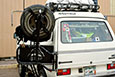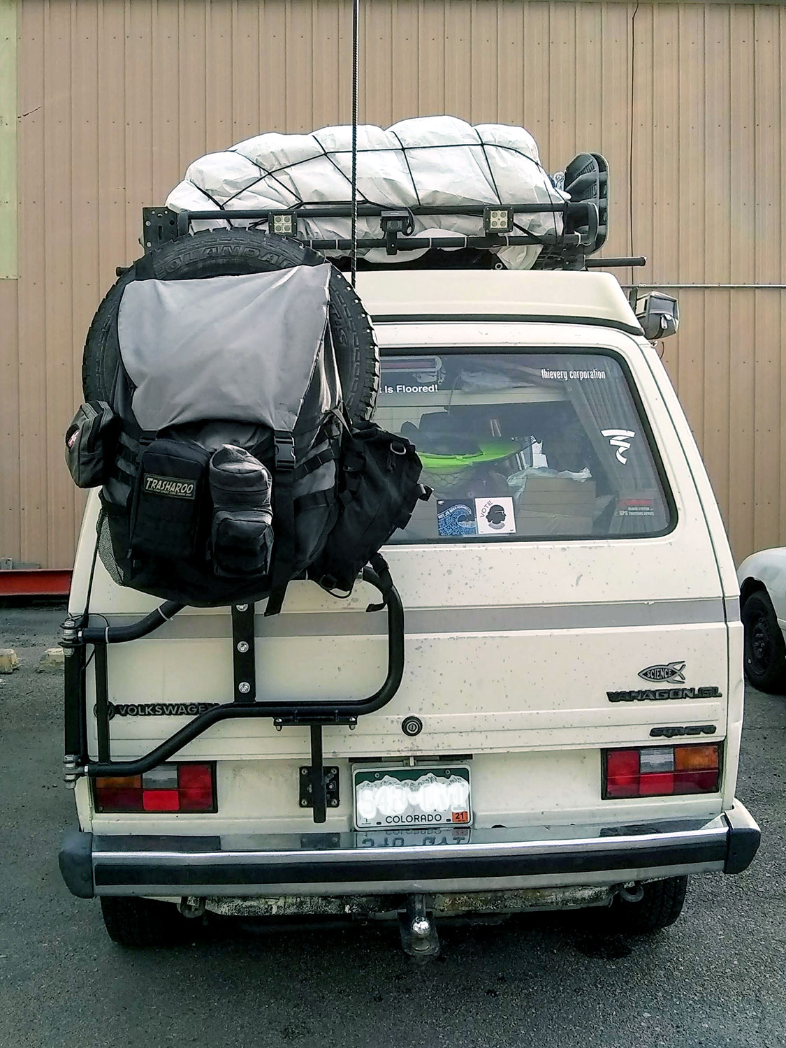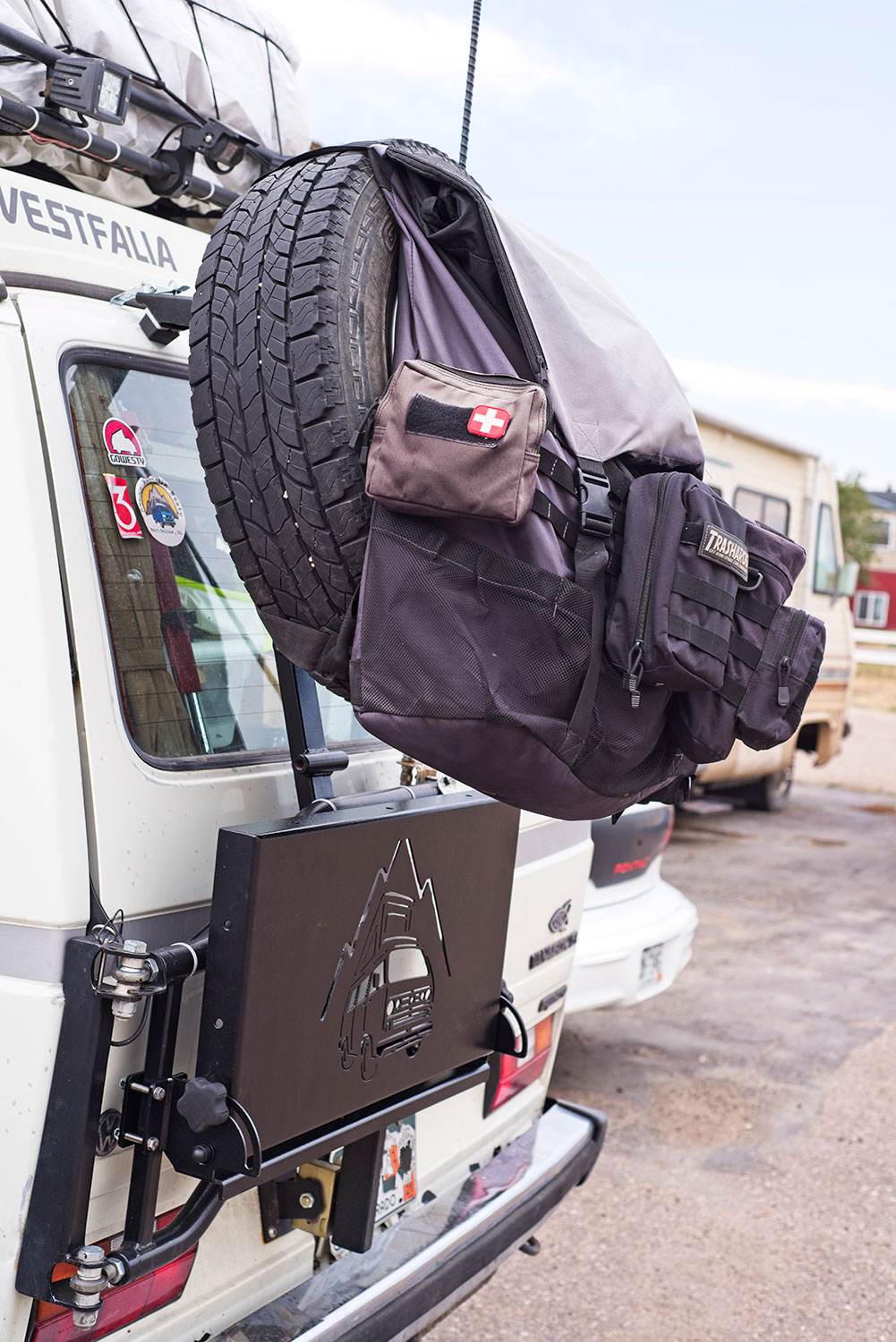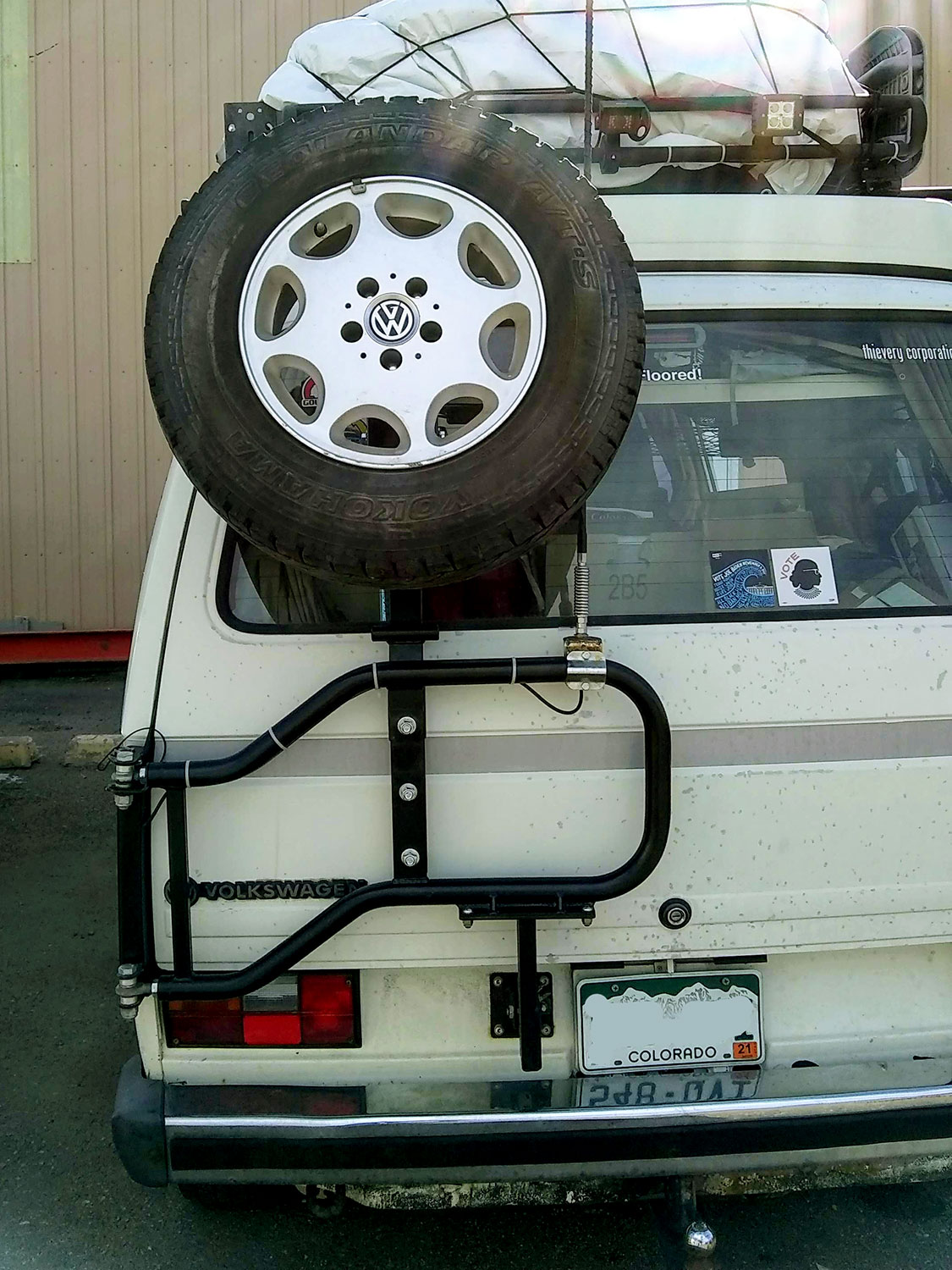 Mountain Westy/Van Cafe sells a swing-away, folding shelf setup similar to my tire carrier, but I have a dent on my right side that prevents another swing-away to be mounted and the dent fix is more than I want to pay. Then I saw that they came out with the "switchback rack system" which could be added to my existing tire carrier system, so I decided I would go that route to allow me to add a folding shelf to hold my gear. There are several options as to the graphics/cutouts on the tray, but I chose the Westy cutout because it's cool! There was also one with the "Syncro" logo/text, which was also cool, but the Westy graphic won out, especially since the van graphic had a South African grill like mine.